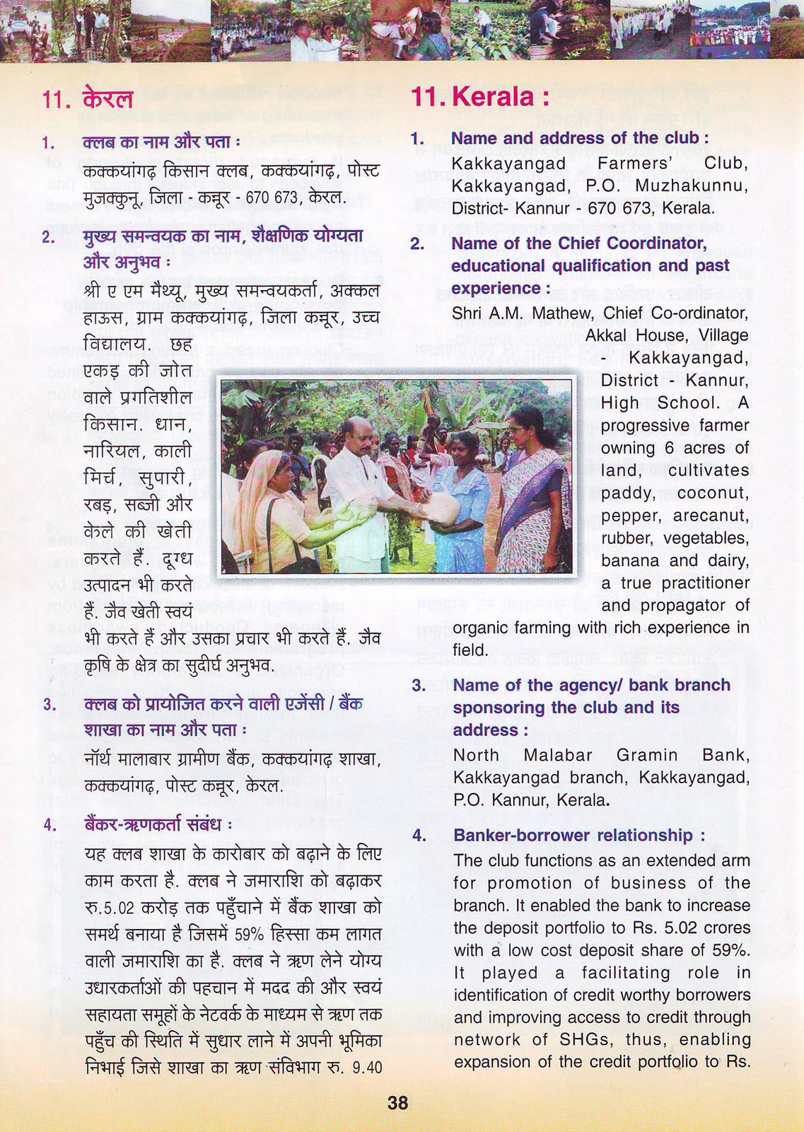 It was at this time that the Branch Manager of Kakkengad branch of North Malabar Gramin Bank under the guidance of then DDM took the initiative to mobilise a few progressive farmers who under the leadership of Shri A.M.Mathew joined hands on 19 March 1996 to give birth to Kakkengad Farmers Club. Undertaking a host of farmer friendly initiatives over the years, the Club grew from strength to strength and has now become a force to reckon with. This Club which won the prestigious best performance award from NABARD for three consecutive years viz, 2004-05, 2005-06 and 2006-2007 and recognition for the Best Farmers' Club at the National level in the year 2007-2008 is now a decade and half old and has many feathers to its cap.
